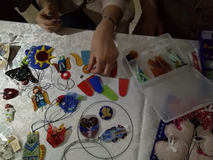 В этот день организаторы решили не ограничиваться только концертом, а привезли с собой целую ярмарку-продажу украшений из стекла в техниках фьюзинг и тиффани, а также эко-сумок. Все они были изготовлены в "Ремесленных мастерских", куда может прийти любой из подопечных нашего Фонда: люди, с неизлечимой стадией рака, их близкие и персонал хосписа. Некоторые украшения были изготовлены нашими волонтёрами, под руководством опытного наставника Юлии Бардиной.
