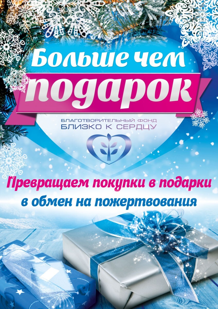 Мы вкладываем в это название особый смысл. Дело в том, что на протяжении всего благотворительного марафона с 12.12.2015 до 31.12.2015 в крупных торговых центрах нашего города: «Фестиваль», «Мега», «Центр», «Апельсин» будут работать стойки упаковки подарков в обмен на пожертвование.
